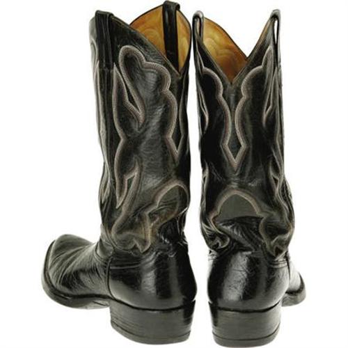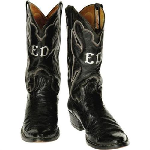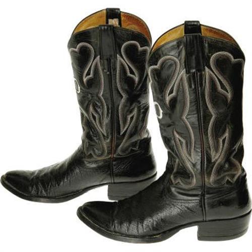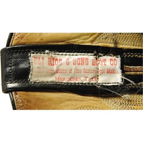 <B>Eddie Dean Boots, Designed by Eli Rios & Sons.</B></I> Eddie Dean (1907-1999) was the Singing Cowboy of Poverty Row's PRC Studios. His low budget Westerns were so-so, but Dean was appealing and his boots were spectacular - as witnessed by this pair of Dean's personal black leather cowboy boots, with a silver trim and a silver "ED" on each boot. These were personally designed and crafted for Dean by the Eli Rios & Sons Boots Co. of Mercedes, Texas, who designed boots for, among other notables, President Dwight D. Eisenhower. Masterfully crafted and Excellent condition.<BR><BR><b>Shipping:</b> Clothing, Costumes & Jerseys (<a target="_blank" href="http://www.heritageauctions.com/common/shipping.php">view shipping information</a>)
