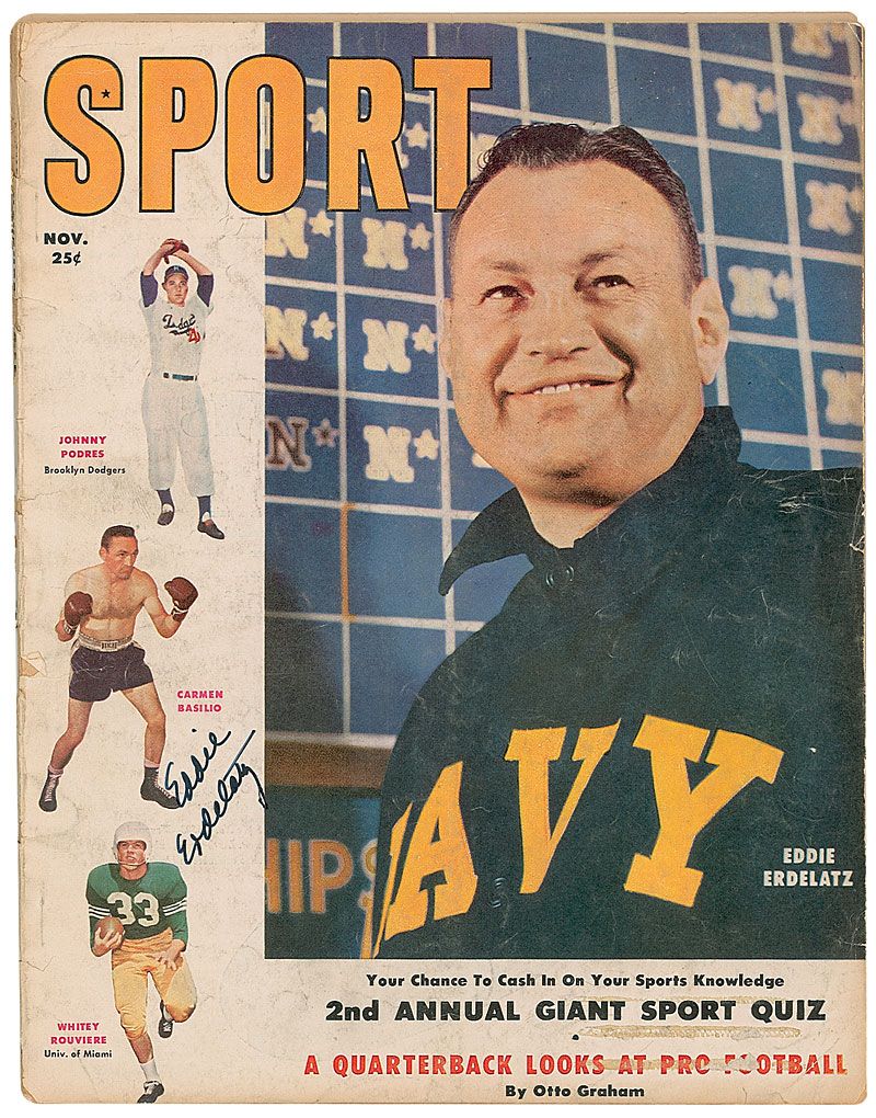 Football player and coach (1913–1966) who served as head coach at Navy for nine years. He was also the first coach in Oakland Raiders’ history. Vintage Sport magazine, dated November 1955, 8.5 x 10.75, 96 pages, featuring a large color image of Erdelatz, signed on the front cover in black felt tip. In very good condition, with scattered creases and a couple tears to the left side of the front cover, and the back cover separated but present.
