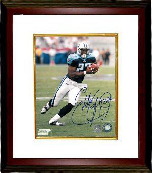 Eddie George won the NFL Rookie of the Year award in 1996, and was the Oilers/Titans' starting tailback through 2003, never missing a start due to injury. He made the Pro Bowl four consecutive years (1997-2000), and assisted the Titans to a championship appearance in Super Bowl XXXIV. His career totals include 10,441 rushing yards, 268 receptions, 2,227 receiving yards, and 78 touchdowns. Eddie George has hand autographed this Tennessee Titans 8x10 Photo. NSD Hologram and Certificate of Authenticity from Athlon Sports Collectibles. Custom White Mat with Premium Mahogany Framing.