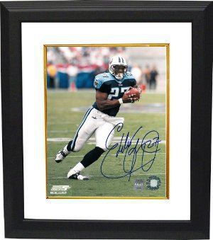 Eddie George won the NFL Rookie of the Year award in 1996, and was the Oilers/Titans' starting tailback through 2003, never missing a start due to injury. He made the Pro Bowl four consecutive years (1997-2000), and assisted the Titans to a championship appearance in Super Bowl XXXIV. His career totals include 10,441 rushing yards, 268 receptions, 2,227 receiving yards, and 78 touchdowns. Eddie George has hand autographed this Tennessee Titans 8x10 Photo. NSD Hologram and Certificate of Authenticity from Athlon Sports Collectibles. Custom White Mat with Premium Black Framing.
