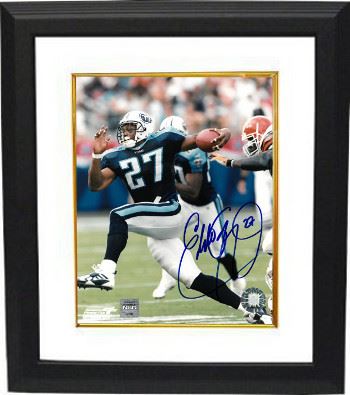 Eddie George won the NFL Rookie of the Year award in 1996, and was the Oilers/Titans' starting tailback through 2003, never missing a start due to injury. He made the Pro Bowl four consecutive years (1997-2000), and assisted the Titans to a championship appearance in Super Bowl XXXIV. His career totals include 10,441 rushing yards, 268 receptions, 2,227 receiving yards, and 78 touchdowns. Eddie George has hand autographed this Tennessee Titans 8x10 Photo. NSD Hologram and Certificate of Authenticity from Athlon Sports Collectibles. Custom White Mat and Premium Black Color Framed as shown.