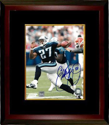 Eddie George won the NFL Rookie of the Year award in 1996, and was the Oilers/Titans' starting tailback through 2003, never missing a start due to injury. He made the Pro Bowl four consecutive years (1997-2000), and assisted the Titans to a championship appearance in Super Bowl XXXIV. His career totals include 10,441 rushing yards, 268 receptions, 2,227 receiving yards, and 78 touchdowns. Eddie George has hand autographed this Tennessee Titans 8x10 Photo. NSD Hologram and Certificate of Authenticity from Athlon Sports Collectibles. Custom Black Mat and Premium Mahogany Color Framed as shown.