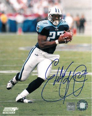 Eddie George won the NFL Rookie of the Year award in 1996, and was the Oilers/Titans' starting tailback through 2003, never missing a start due to injury. He made the Pro Bowl four consecutive years (1997-2000), and assisted the Titans to a championship appearance in Super Bowl XXXIV. His career totals include 10,441 rushing yards, 268 receptions, 2,227 receiving yards, and 78 touchdowns. Eddie George has hand autographed this Tennessee Titans 8x10 Photo. NSD Hologram and Certificate of Authenticity from Athlon Sports Collectibles.