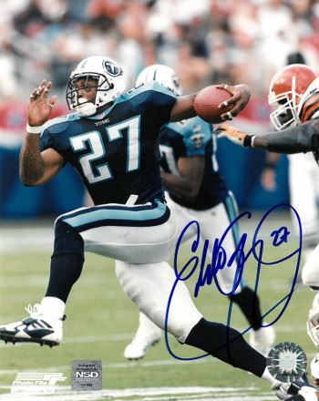 Eddie George won the NFL Rookie of the Year award in 1996, and was the Oilers/Titans' starting tailback through 2003, never missing a start due to injury. He made the Pro Bowl four consecutive years (1997-2000), and assisted the Titans to a championship appearance in Super Bowl XXXIV. His career totals include 10,441 rushing yards, 268 receptions, 2,227 receiving yards, and 78 touchdowns. Eddie George has hand autographed this Tennessee Titans 8x10 Photo. NSD Hologram and Certificate of Authenticity from Athlon Sports Collectibles.