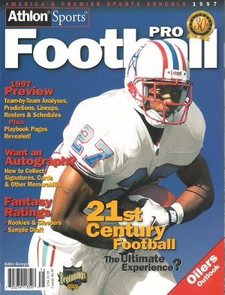 This is an Athlon Sports 1997 Pro Football Magazine with Houston Oilers Runningback Eddie George on the cover. This Preview has team analysis, predictions, lineups, rosters and more for the 1997 Season