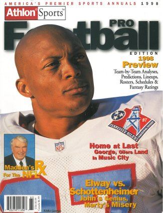 This is an Athlon Sports 1998 Pro Football Magazine with Tennessee Oilers/Titans Runningback Eddie George on the cover. This Preview has team analysis, predictions, lineups, rosters, schedules, fantasy ratings and more for the 1998 Season