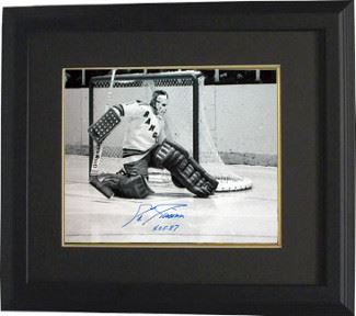 Eddie Giacomin was impressive in his first month as Rangers goaltender, but faltered thereafter, and lost his starting job in New York. The following season he improved markedly, leading the NHL in shutouts and backstopping the Rangers to only their second playoff berth in nine seasons. A classic stand-up goaltender and a skilled stickhandler known for leaving the crease to play the puck, Giacomin would be the Rangers' starting goaltender for the next nine seasons, leading the league in games played four straight years from 1967, in shutouts in 1967, 1968 and 1971, and sharing the Vezina Trophy with partner Gilles Villemure in 1971. Eddie Giacomin has hand signed this New York Rangers 16X20 B&W Photo with HOF 87 inscription. Leaf or MAB Hologram and Certificate of Authenticity from Athlon Sports. Custom Black Mat and Premium Black Color Framed as shown.