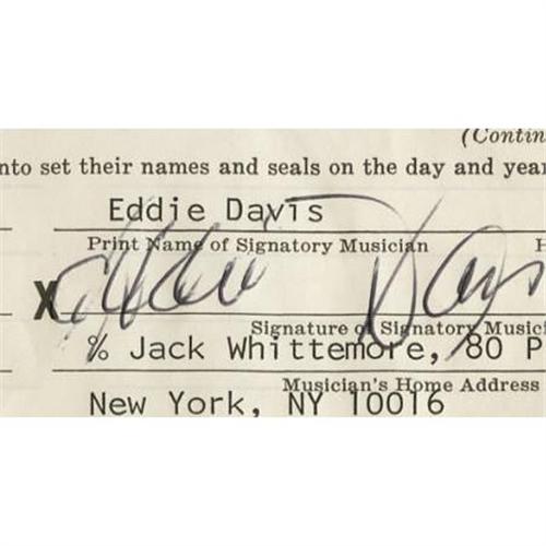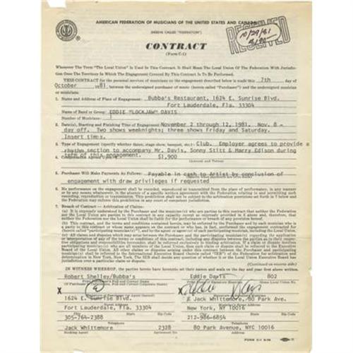<B>Eddie "Lockjaw" Davis Signed Contract.</B></I> A one-page, double-sided American Federation of Musicians contract, dated October 7, 1981, employing Jazz greats Eddie "Lockjaw" Davis, Sonny Stitt, and Harry Edison to appear at Bubba's in Fort Lauderdale for nine evenings from November 2-12, 1981, for a total of $1,900. Signed by Davis on the front in black ink. In Excellent condition with slight tanning and edge wear and staple holes to the top left corner.<BR><BR><b>Shipping:</b> Flat Material, Small (<a target="_blank" href="http://www.heritageauctions.com/common/shipping.php">view shipping information</a>)