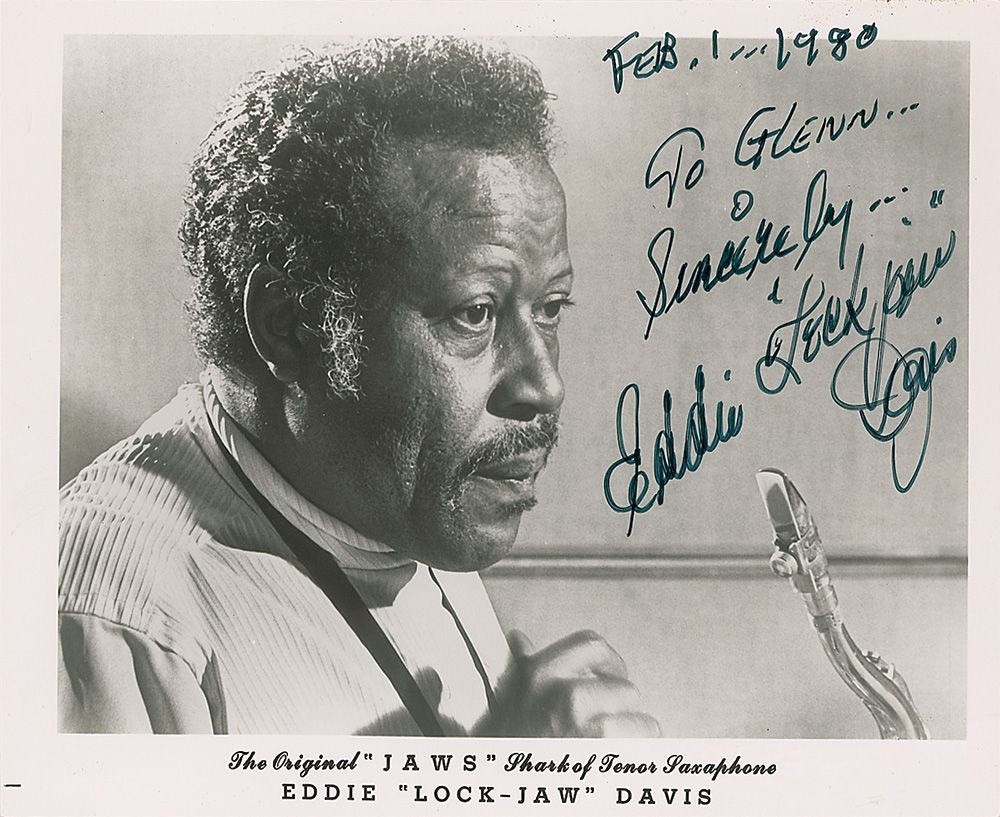 Glossy 10 x 8 publicity photo, signed and inscribed in black felt tip “To Glenn, Sincerely, Eddie ‘Lockjaw’ Davis,” and adding the date, “Feb. 1, 1980.” In fine condition.