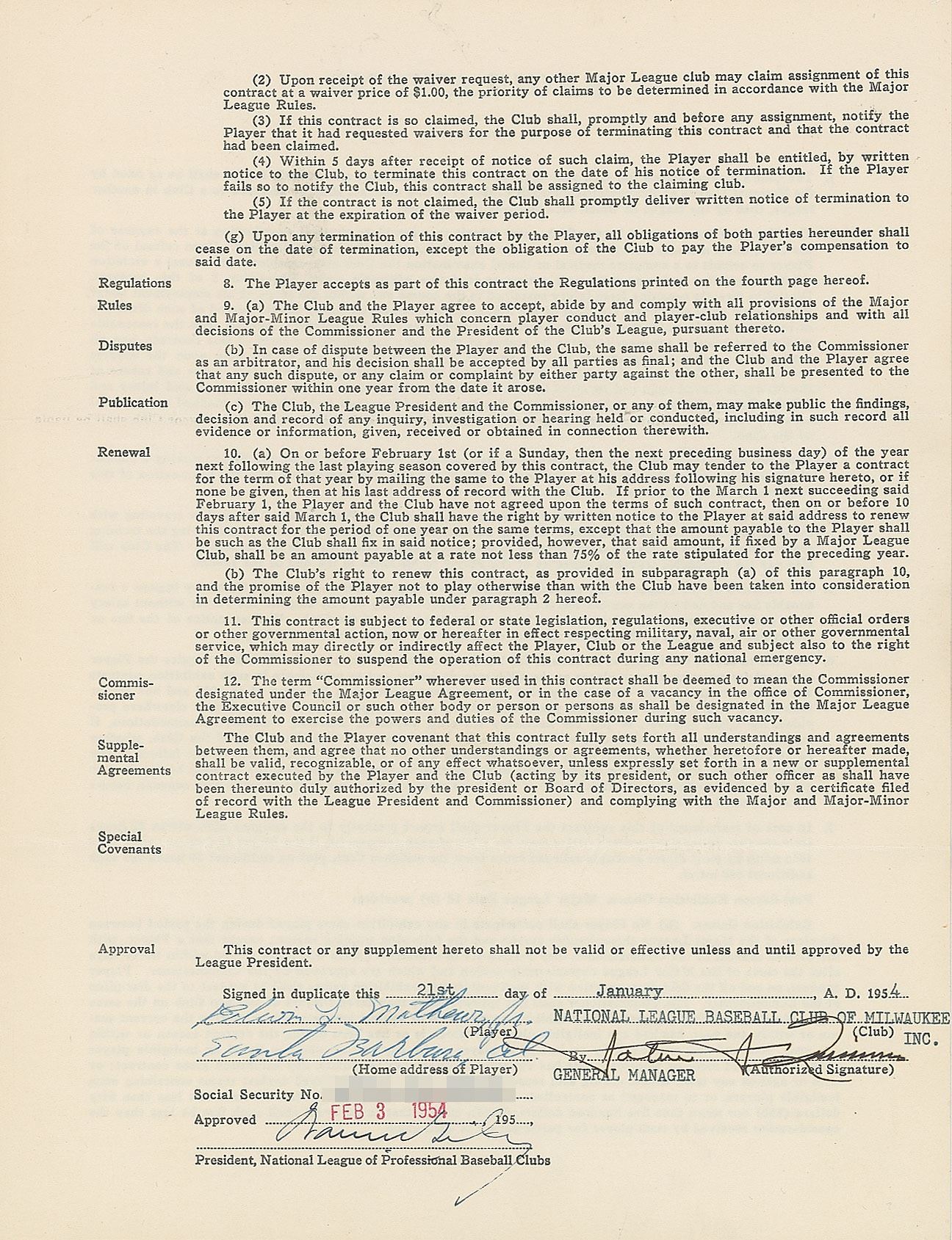 Contract, signed “Edwin L. Mathews, Jr.,” four pages on two adjoining sheets, 8.5 x 11, January 21, 1954. National League uniform player’s contract in which Eddie Mathews agrees to render "skilled services as a baseball player during the year 1954" for the Milwaukee Braves, for a salary of $35,000. Signed at the conclusion in blue ballpoint by Mathews, who adds his address and social security number, and countersigned by Braves General Manager John J. Quinn and National League President Warren Giles. In fine condition. In 1953, Mathews led the league in home runs with 47 which encouraged the Braves to give him a huge pay raise. He did not disappoint, hitting 40 home runs to compliment the arrival of Aaron in '54.