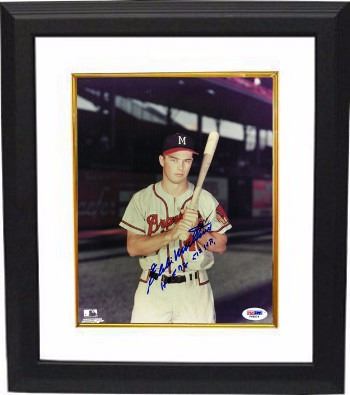 Eddie Mathews played in Major League Baseball as a third baseman, most notably on the Milwaukee Braves. Mathews is regarded as one of the greatest third basemen ever to play the game. He was inducted into the National Baseball Hall of Fame in 1978. Mathews was regarded as one of the strongest power hitters of his time, often being compared to American League contemporary Mickey Mantle, in terms of power hitting strength. Hall-of-Fame teammate Warren Spahn once said of the two: "Mathews is just as strong as Mantle. Eddie Mathews (deceased) has hand signed this Milwaukee Braves 8x10 Photo with dual HOF 78 and 512 HRs inscriptions. PSA Hologram and Certificate of Authenticity from Athlon Sports. Custom White Mat and Premium Black Color Framed as shown.