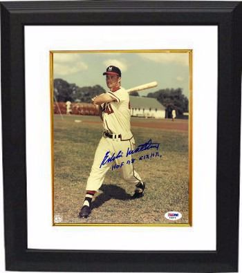 Eddie Mathews played in Major League Baseball as a third baseman, most notably on the Milwaukee Braves. Mathews is regarded as one of the greatest third basemen ever to play the game. He was inducted into the National Baseball Hall of Fame in 1978. Mathews was regarded as one of the strongest power hitters of his time, often being compared to American League contemporary Mickey Mantle, in terms of power hitting strength. Hall-of-Fame teammate Warren Spahn once said of the two: "Mathews is just as strong as Mantle. Eddie Mathews (deceased) has hand signed this Milwaukee Braves 8x10 Photo with dual HOF 78 and 512 HRs inscriptions. PSA Hologram and Certificate of Authenticity from Athlon Sports. Custom White Mat and Premium Black Frame as shown.