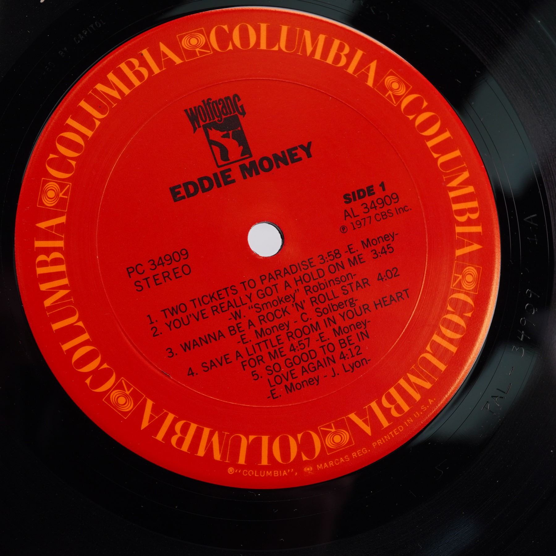 Eddie Money - Eddie Money self-titled debut vinyl LP album, released in 1977 on Columbia Records (PC 34909). A breakout release that launched Money's career, the album includes the iconic rock radio staples Two Tickets to Paradise and Baby Hold On, as well as his energetic rendition of Smokey Robinson's You've Really Got a Hold on Me. The record showcases his gritty vocals and tight songwriting, backed by slick late-70s production. Cover features a high-contrast black-and-white portrait of Money, sharply dressed with tousled hair and cigarette in hand, echoed on both sides of the jacket. Pressed on the red Columbia label with the Wolfgang logo. Sleeve shows moderate edge wear and light scuffing; vinyl clean and well-maintained.