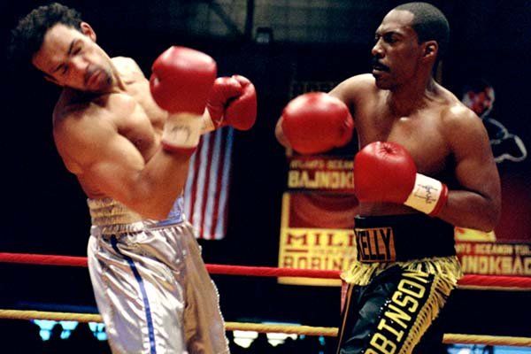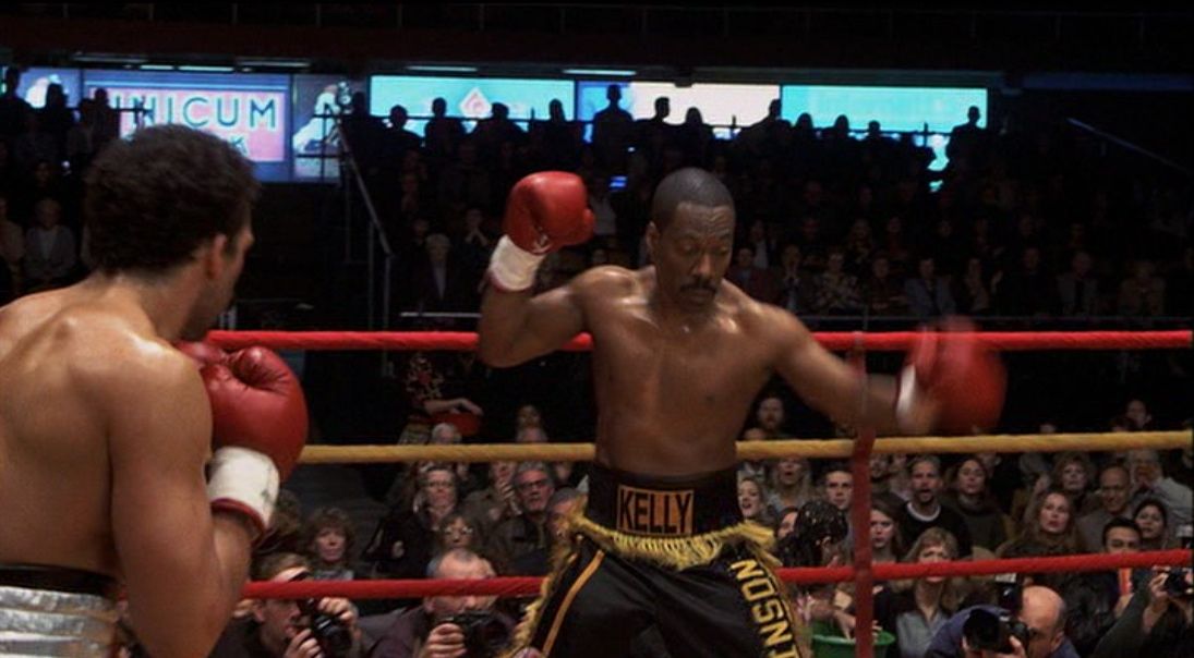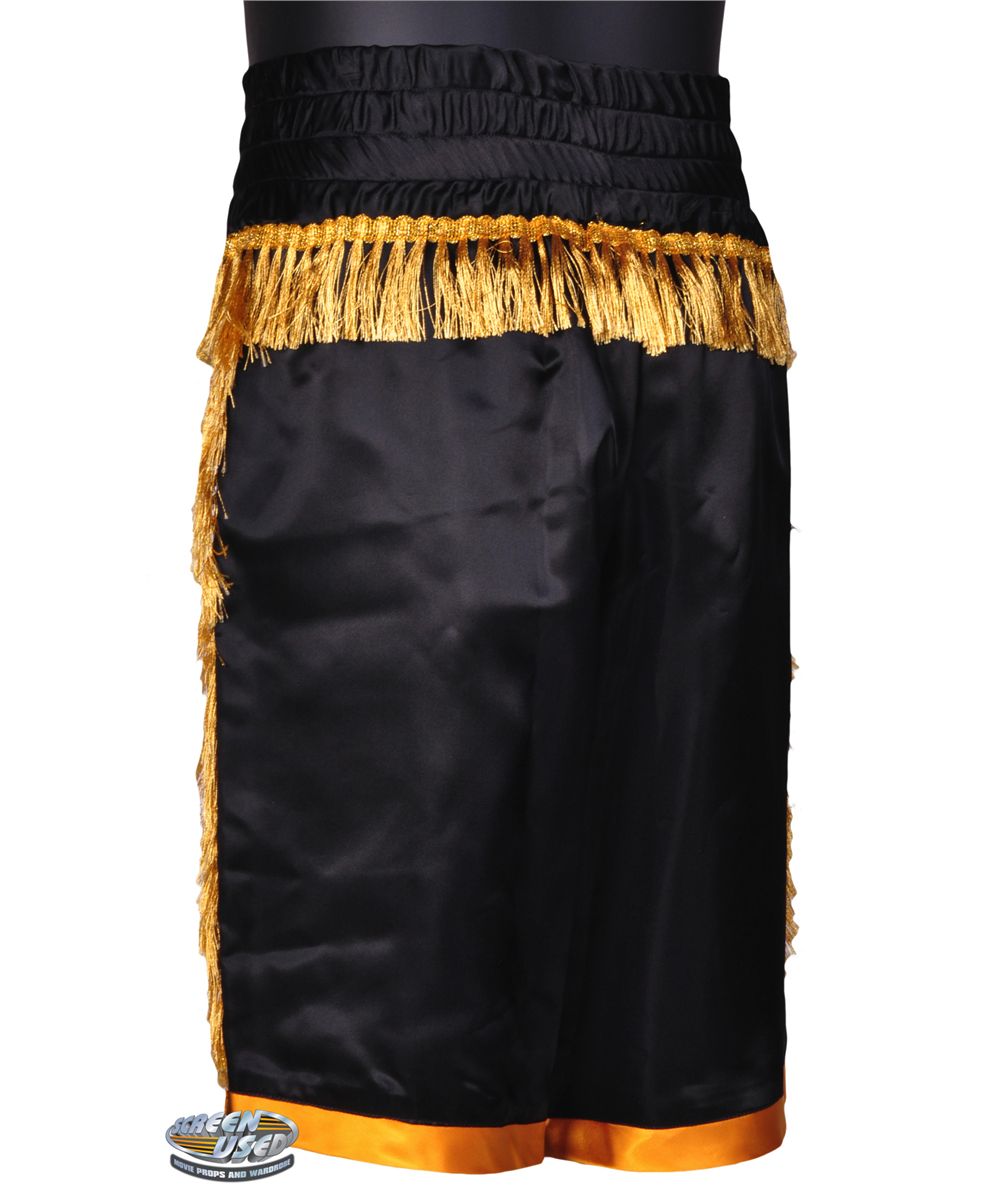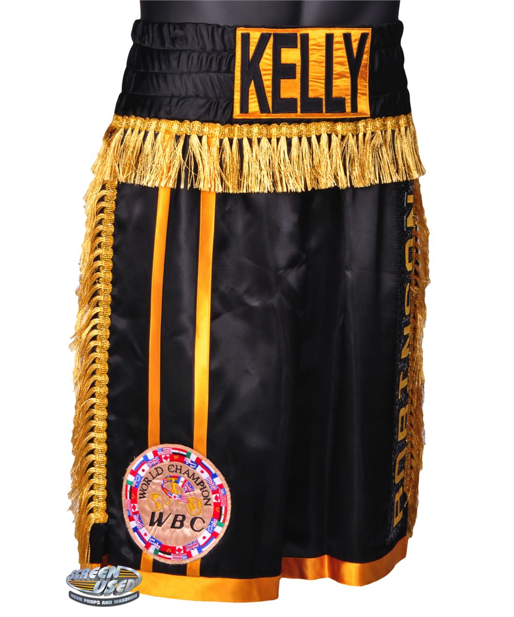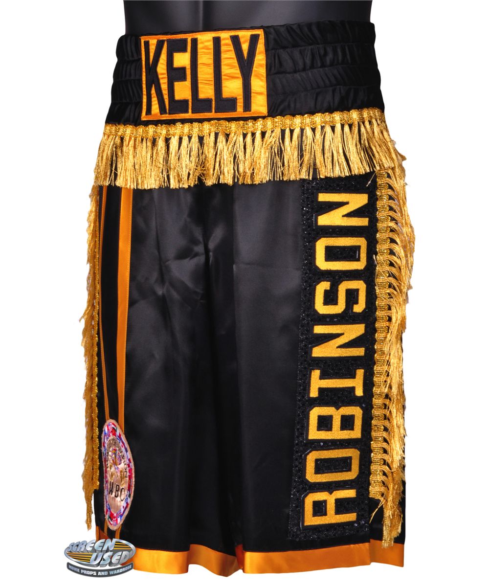 (Columbia, 2002) These boxing shorts were custom-made for the production for use by Eddie Murphy as Kelly Robinson. The shorts are black with gold trim and feature "Kelly" at the waist, "Robinson" down the side of the left leg and the World Boxing Champion logo patch attached to the right leg.