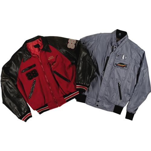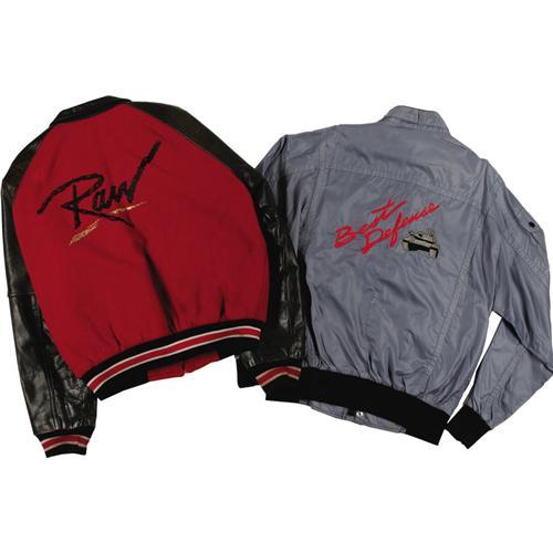 <B>Eddie Murphy Tour Jackets.</B></I> Included is a red-and-black varsity jacket with "Raw" embroidered on the back, worn by him during his 1987 comedy tour, plus a grey nylon racing jacket given to cast and crew members of the 1984 comedy movie <I>Best Defense,</B></I> with the film's logo on the back. Both are in Excellent condition with a little wear to the sleeves of the "Raw" jacket.<I>From the Robert Johnson Memorabilia Collection.</B></I><BR><BR><b>Shipping:</b> Clothing, Costumes & Jerseys (<a target="_blank" href="http://www.heritageauctions.com/common/shipping.php">view shipping information</a>) <BR><BR><B>Important noti
