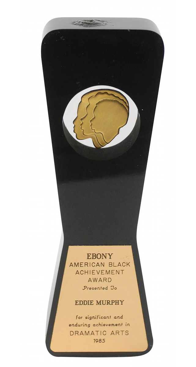Ebony magazine’s American Black Achievement Award presented to Eddie Murphy in 1985 for his contributions to the dramatic arts. Award measures 11.5? tall, with a gold silhouette in the upper portion of the award and a presentation plaque affixed to the bottom. In fine condition, with a bubble to finish along top edge.