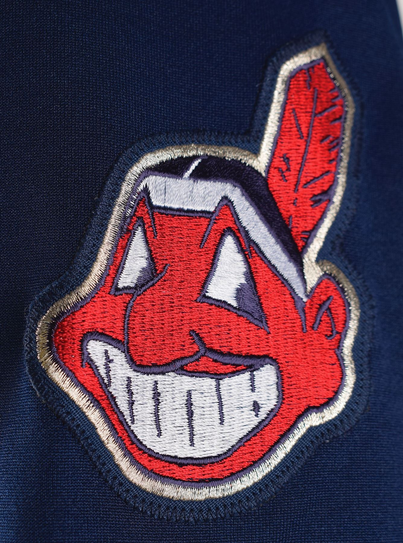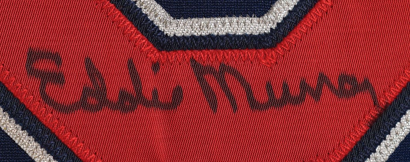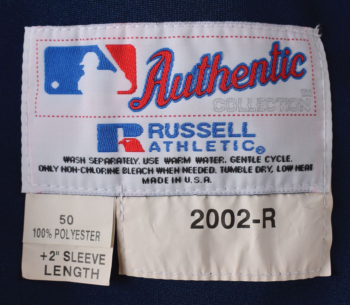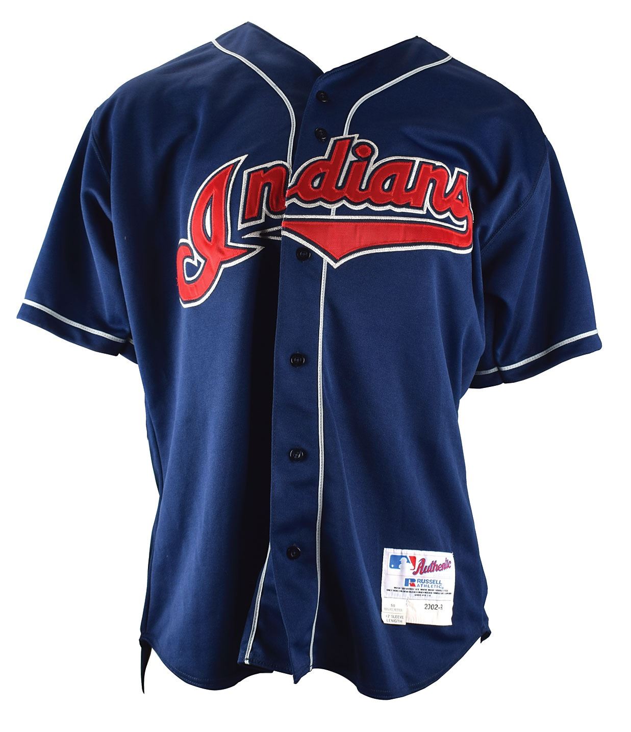 Eddie Murray's game-used official Cleveland Indians dark navy home jersey from the 2002 season. The jersey features "Indians" across the chest in red, navy, and silver tackle twill, with "Murray" and his number "33" on the back, signed on the right numeral in black felt tip, "Eddie Murray." On the left sleeve is an embroidered Chief Wahoo logo patch. The front left tail has the Russell Athletic Authentic Collection tag, with flag tags noting the size and material, "50, 100% Polyester" and "+2? Sleeve Length," and a strip tag indicating the year, "2002-R." In fine condition. Following a historic playing career in which he hit 504 home runs, Murray joined the Cleveland Indians coaching staff in 2002; he served as the team's hitting coach from 2002 to 2005, and was with the Indians when he was inducted into the Hall of Fame in 2003. Accompanied by a certificate of authenticity from the Cleveland Indians.