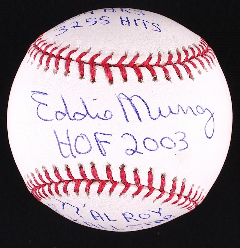 Official Major League Baseball. Hand-signed and inscribed in blue ink pen by Eddie Murray (Orioles HOF). Inscriptions include "HOF 2003" "8x All Star" "77 AL ROY" "504 HRs" and "3255 Hits."Â The autograph includes an official PSA/DNA hologram and an official James Spence Authentication (JSA) hologram for authenticity purposes.