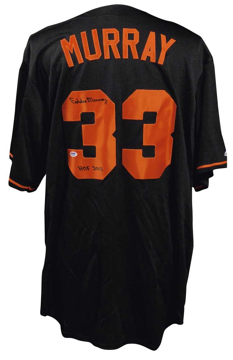 Official Majestic replica Baltimore Orioles baseball jersey, with sewn-on letters and numbers, signed in black felt tip “Eddie Murray HOF 2003.” Accompanied by a certificate of authenticity from PSA/DNA. In very fine condition. RRAuction COA.