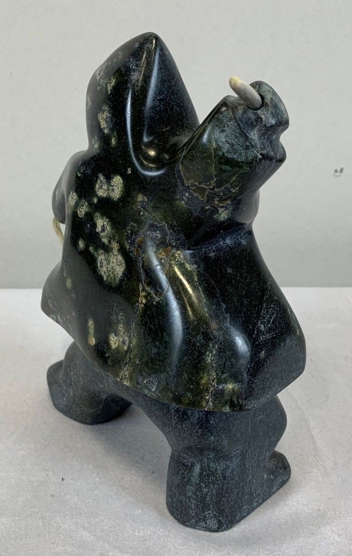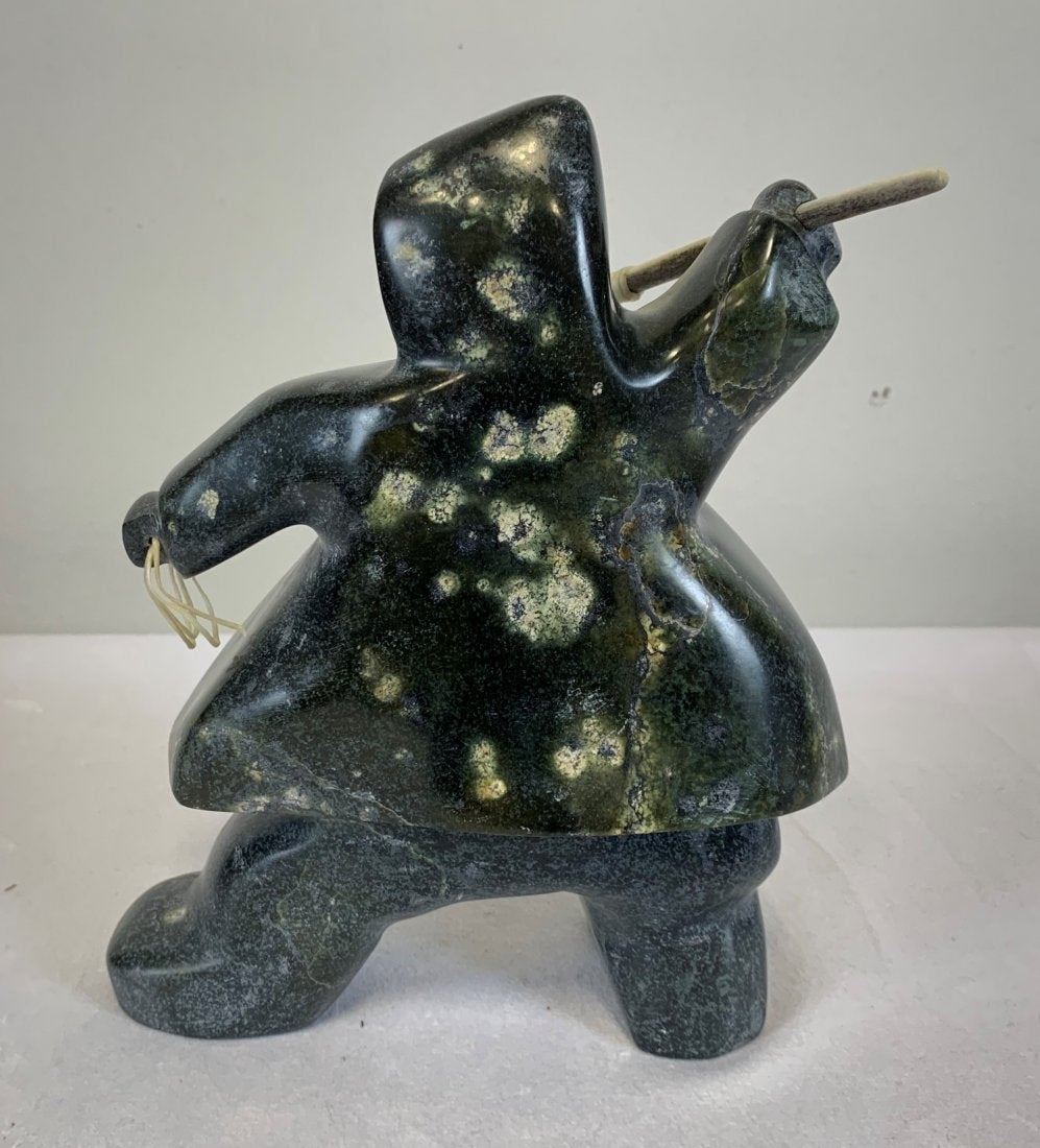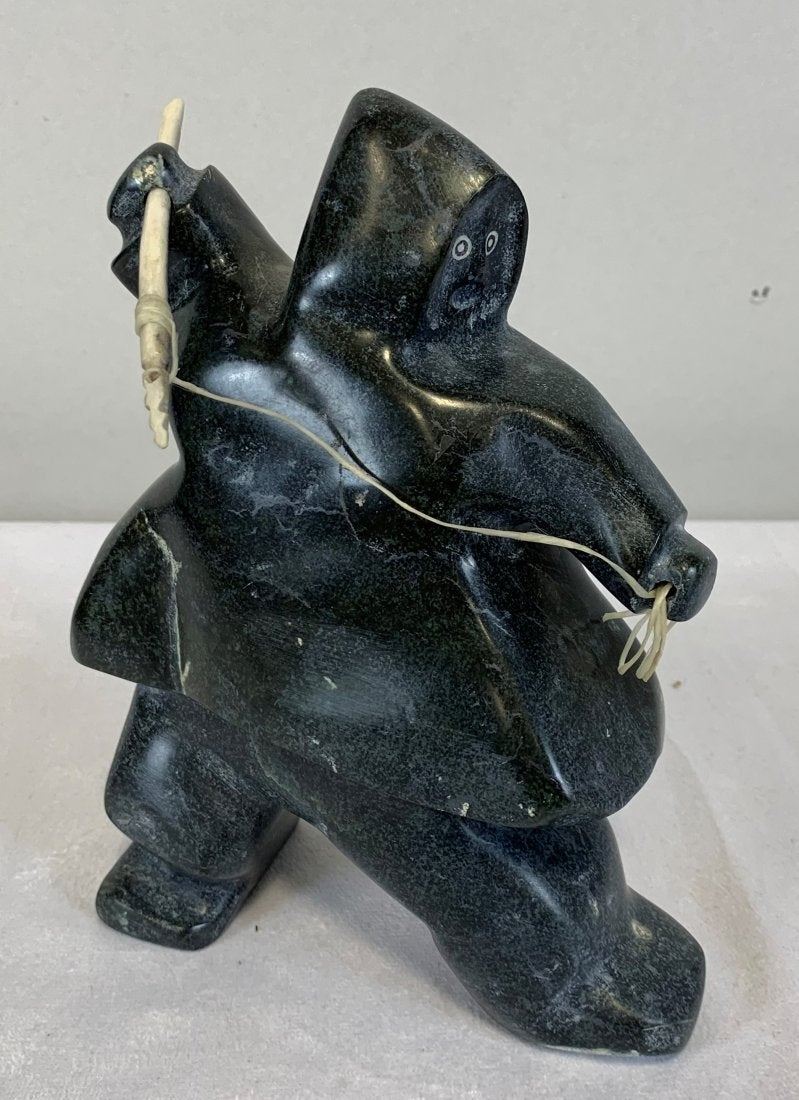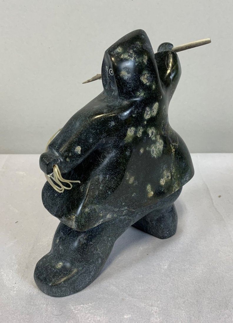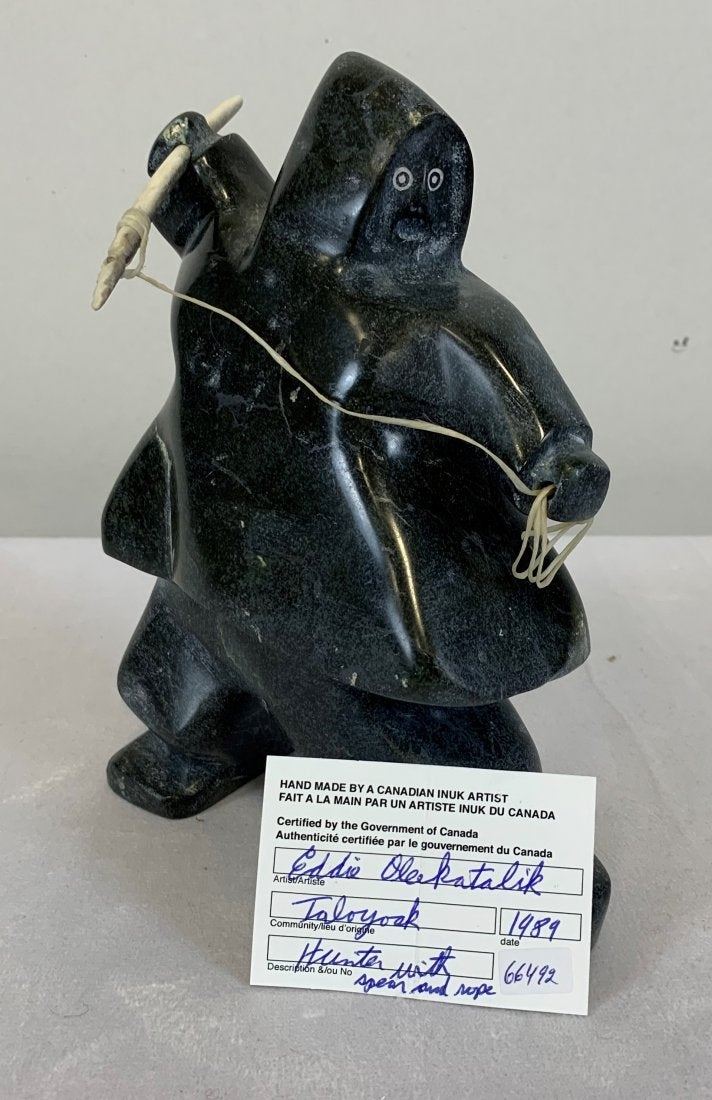 Eddie Oleekatalik's "Hunter With Spear and Rope" original Inuit sculpture. Carved from stone in 1989 from the community of Taloyoak. Included with its certificate of authenticity from the Government of Canada. Retail price of $1,800. 66492. 6 1/4" x 3" x 7 3/4" tall.