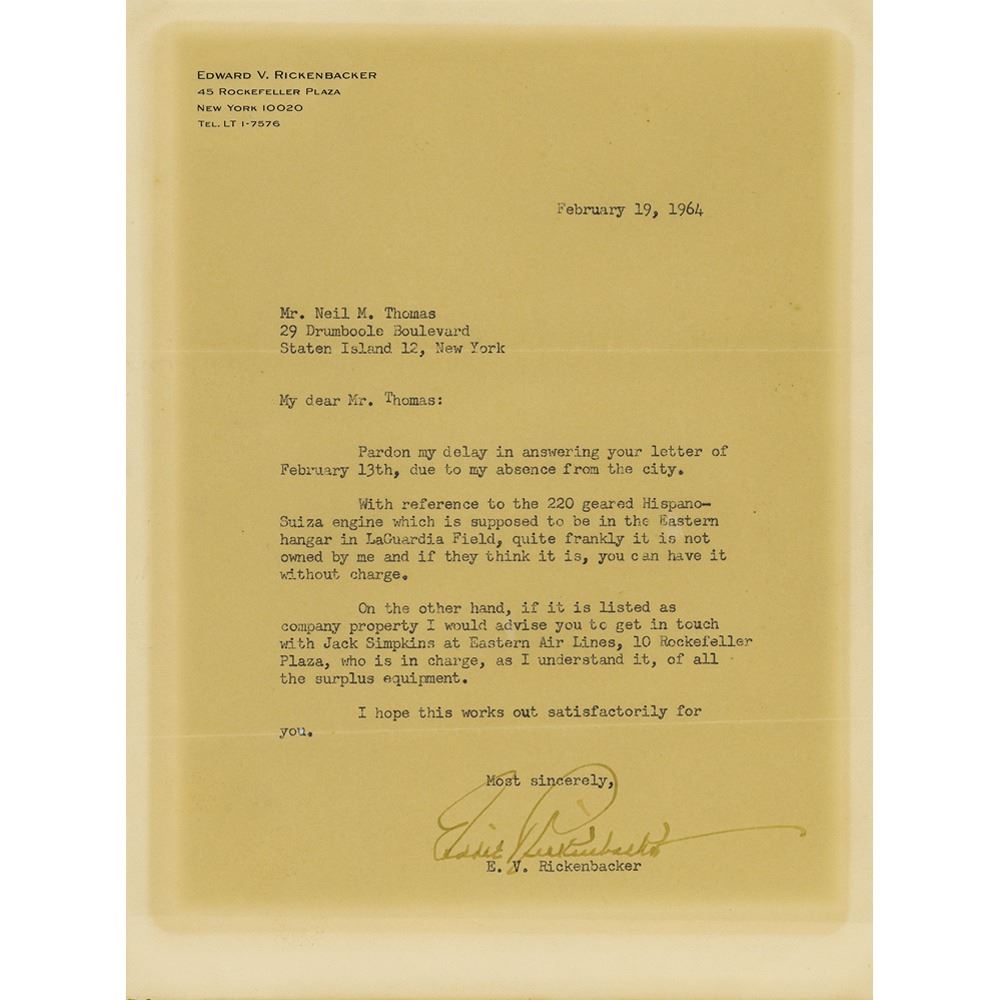 TLS, one page, 7.25 x 9.75, personal letterhead, February 19, 1964. Letter to Neil M. Thomas, in part: “With reference to the 220 geared Hispano-Suiza engine which is supposed to be in the Eastern hangar in LaGuardia Field, quite frankly it is not owned by me and if they think it is, you can have it without charge. On the other hand, if it is listed as company property I would advise you to get in touch with Jack Simpkins at Eastern Air Lines, 10 Rockefeller Plaza, who is in charge, as I understand it, of all the surplus equipment.” In very good to fine condition, with toning from prior display.