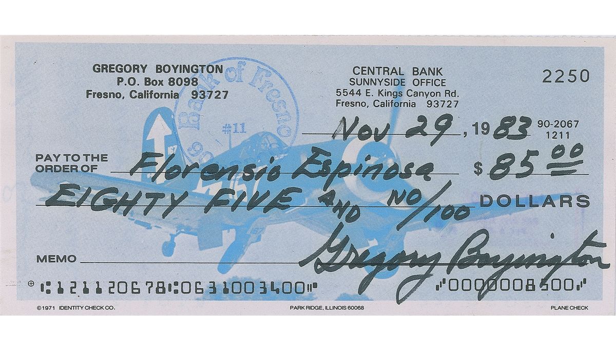 Two checks: personal check, 6 x 2.75, filled out in another hand and signed by Rickenbacker, “E. V. Rickenbacker,” payable to his son, William F. Rickenbacker, for $25.30, May 27, 1971; and a personal check, 6 x 2.75, filled out and signed by Boyington, “Gregory Boyington,” payable to Florensio Espinosa for $85, November 29, 1983. In overall fine condition, with expected bank stamps.