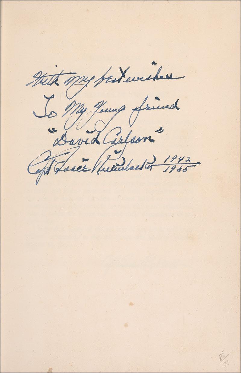Two hardcover books; Rickenbacker, signed on the first free end page in black ink, with an owner’s bookplate affixed under signature; and Seven Came Through, signed and inscribed on the first free end page. Some light soiling to second signed page, weak hinge to first book, as well as some light wear to its dustjacket, otherwise fine condition.