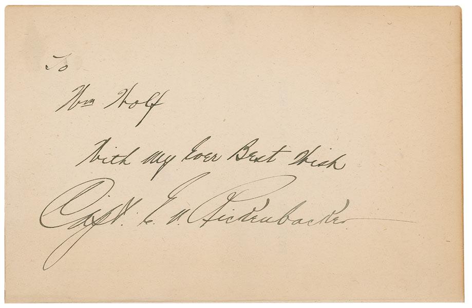Signed book: Fighting the Flying Circus. First edition. NY: Stokes, 1919. Hardcover, 5.25 x 8, 371 pages. Signed and inscribed in fountain pen on the reverse of the half title page “To Wm. Hoff, With my ever [sic] best wish, Capt. E. V. Rickenbacker.” In very good condition, with signed page and other opening pages detached from book, mild toning to signed page, separated, but attached, back hinge, light wear to bottoms of covers, as well as wear and partial separations to joints.