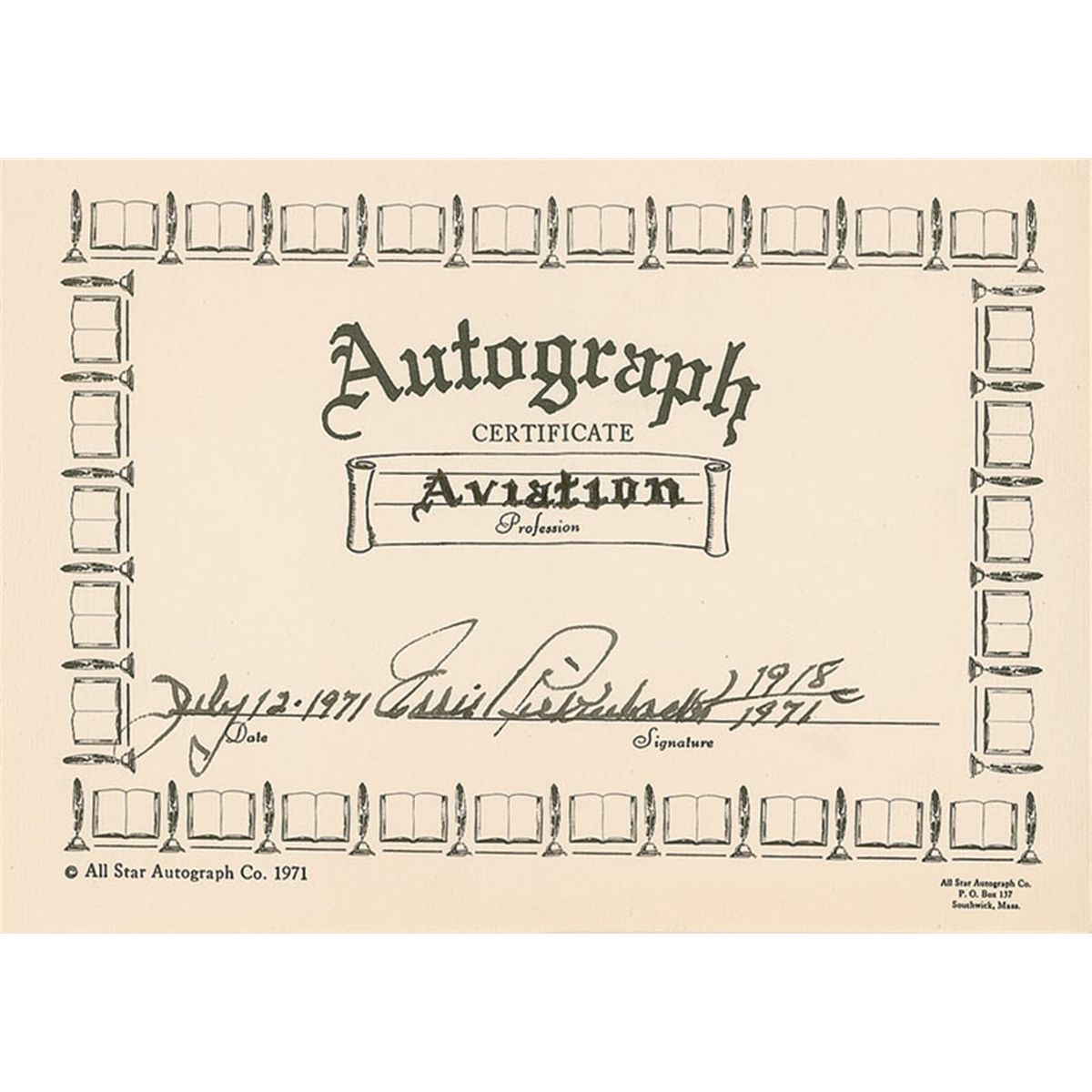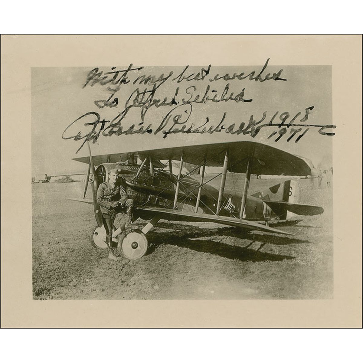Two items: All Star Autograph Certificate, 7 x 5, signed and dated in fountain pen, “July 12, 1971, Eddie Rickenbacker, 1918/1971”; and a glossy 5 x 4 photo of the pilot and his plane, signed and inscribed in fountain pen, “With my best wishes to Alfred Sebilia, Captain Rickenbacker, 1918/1971.” In fine condition, with moderate brushing and irregular ink adhesion to the inscription and signature.