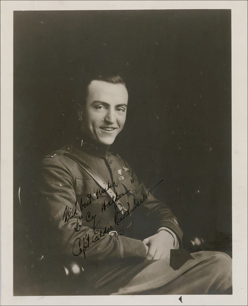 America’s top World War I ace (1890–1973), with 26 victories. Vintage matte-finish 8 x 10 photo, signed and inscribed in fountain pen “With best wishes to ‘Cy’ Halpern, Capt. Eddie Rickenbacker.” In very good condition, with a mounting remnant affixed to lower right of image, scattered surface marks, a bit of light spotting, and moderate silvering to image and background.