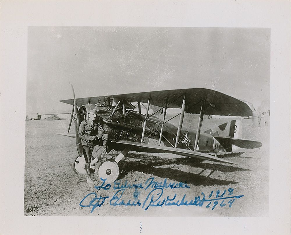 Vintage glossy 5 x 4 photo of Rickenbacker posing with his biplane, signed and inscribed in fountain pen. In fine condition, with some brushing and irregular adhesion to the inscription and signature.