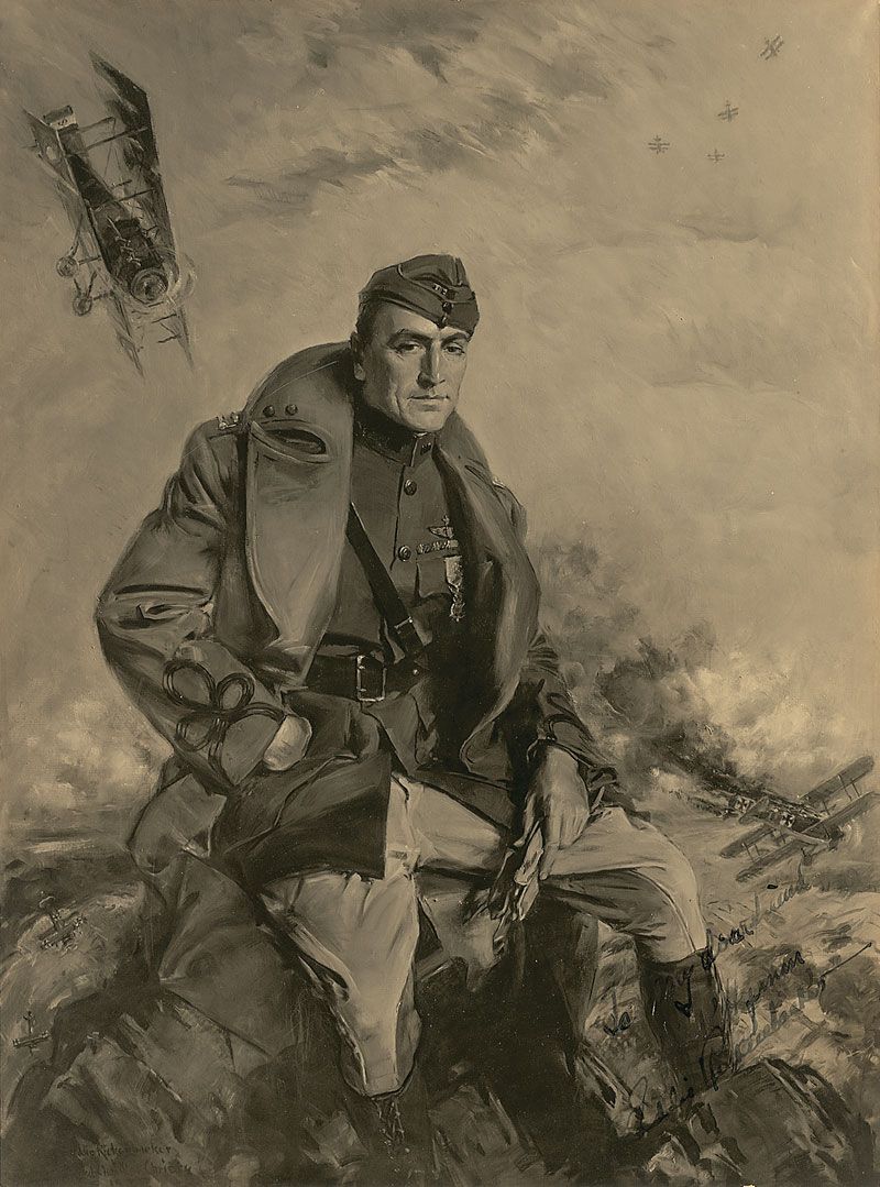 Vintage matte-finish 9.5 x 12.75 photo of a painted portrait of Rickenbacker, signed and inscribed in fountain pen, “To my dear friend Dick Hyman, Eddie Rickenbacker.” Poor contrast to most of the signature, otherwise fine condition.