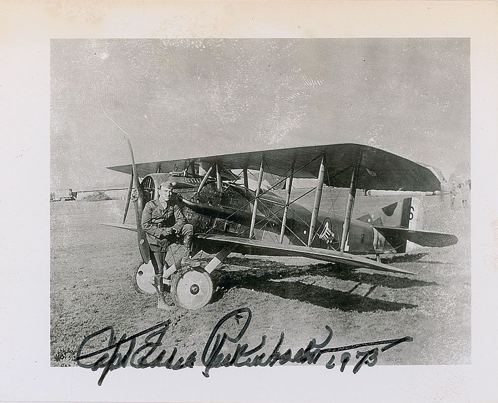 Glossy 5 x 4 photo of Rickenbacker posing in front of his biplane, signed in black felt tip, “Eddie Rickenbacker 1973.” In fine condition, with a few light surface marks and some light toning along top border. Accompanied by a 1973 TLS from Rickenbacker’s secretary acknowledging the photo.