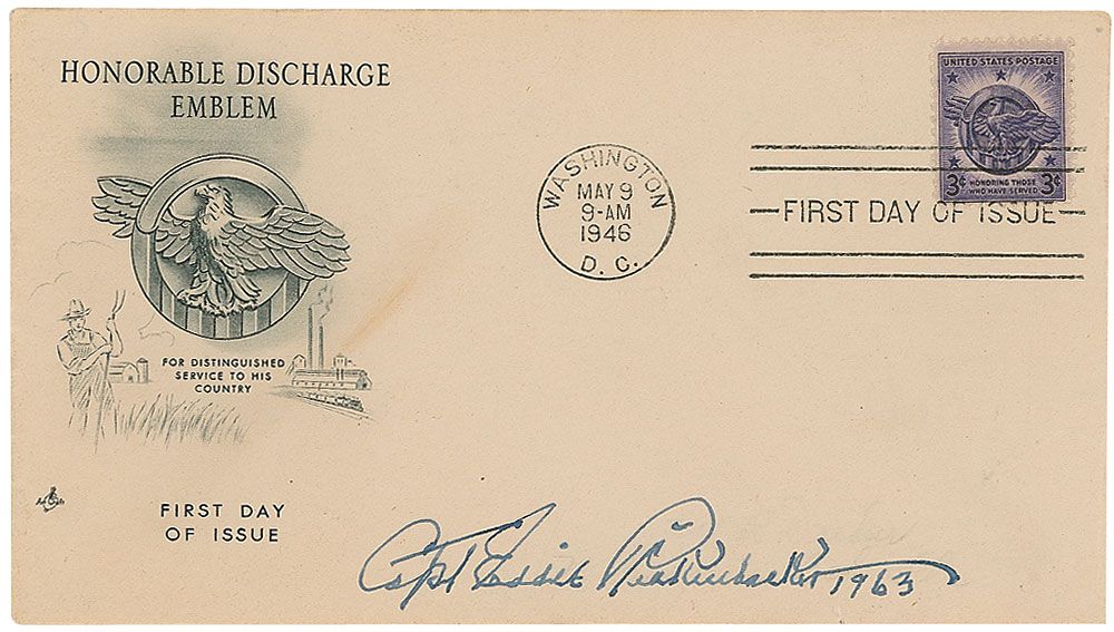 FDC with a cachet of the Honorable Discharge emblem, signed in fountain pen, “Capt. Eddie Rickenbacker 1963.” In fine condition, with a uniform shade of toning.