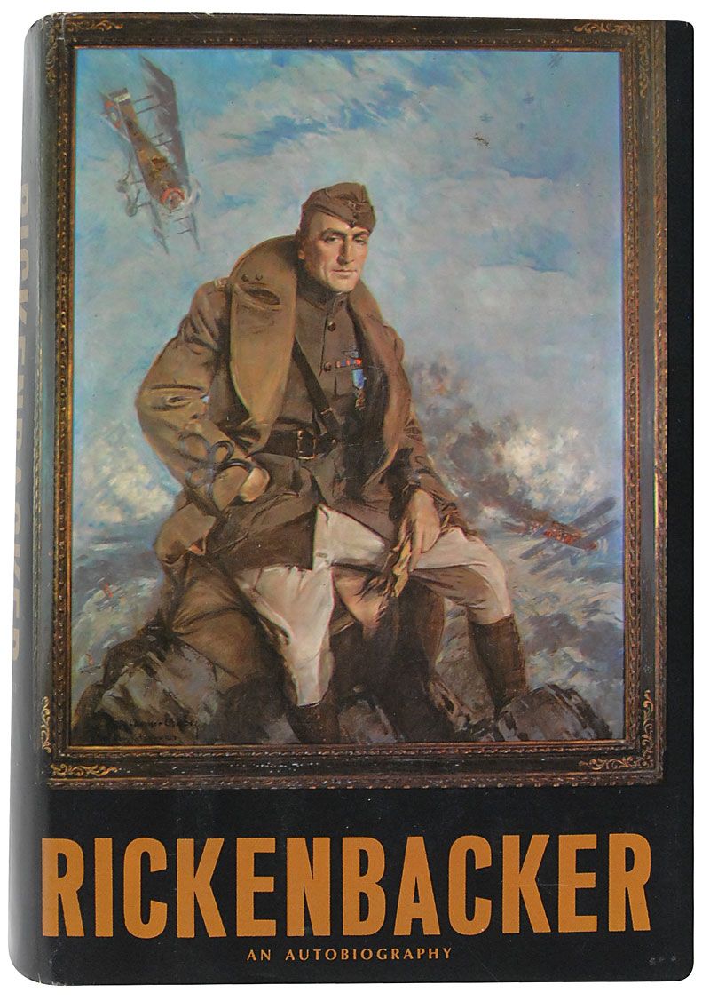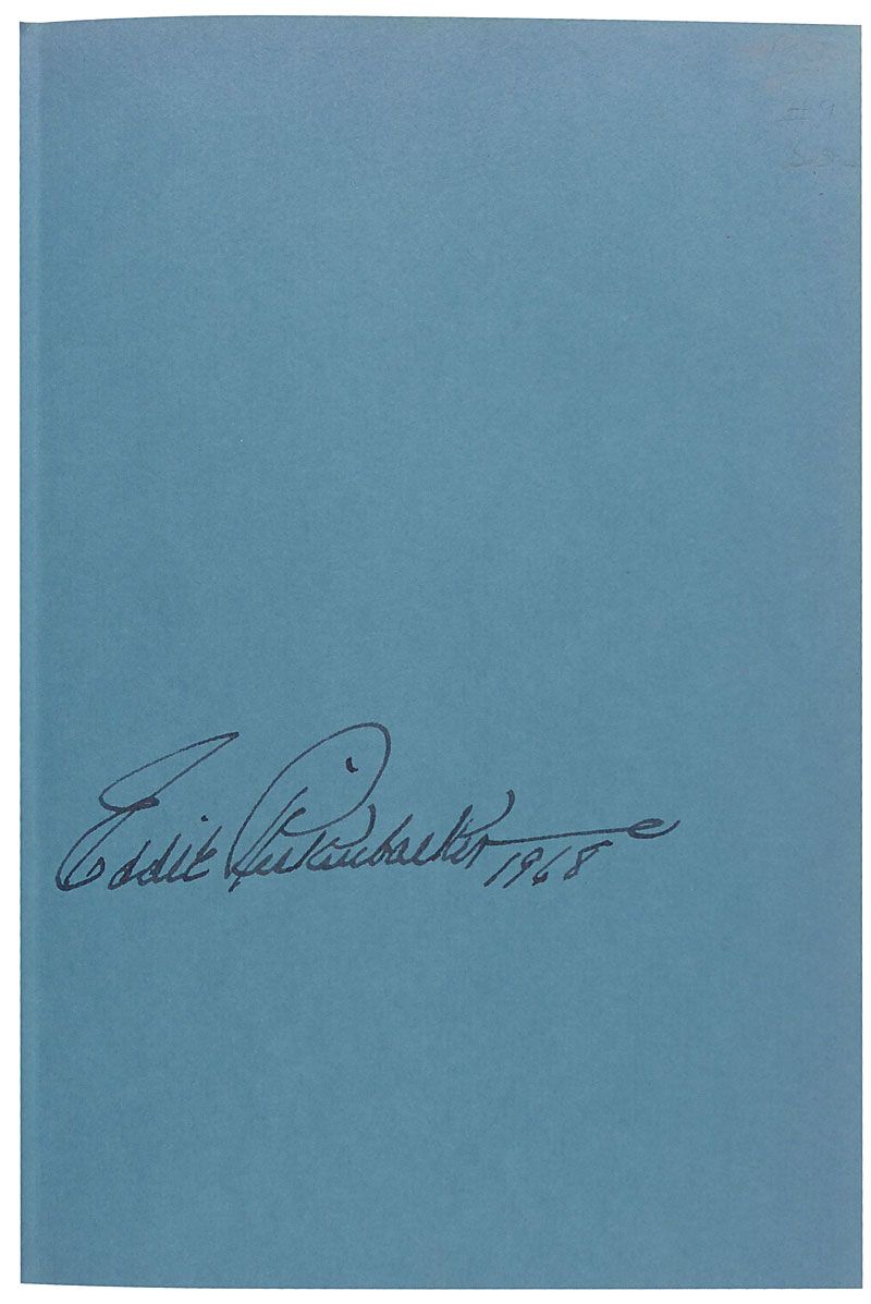 Signed book: Rickenbacker. Later printing. New Jersey: Prentice-Hall, 1967. Hardcover with dust jacket, 6.5 x 9.25, 458 pages. Signed on the first free end page in black ink, “Eddie Rickenbacker 1968.” In very good condition, with slight toning to fore-edges, a mild tobacco odor, and scattered wear to dust jacket.