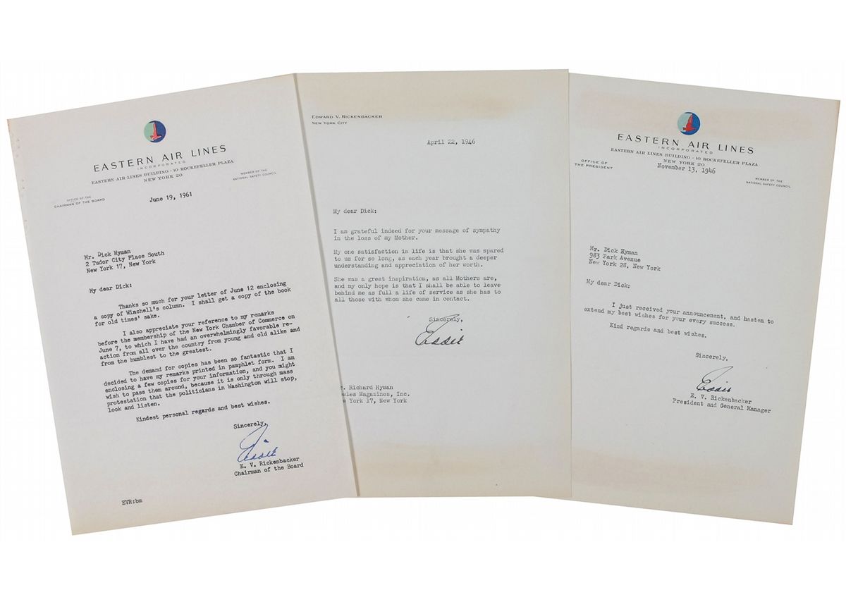 Three one-page TLSs, all signed “Eddie,” two from 1946 and one from 1961, all 7.25 x 10, all to Dick Hyman. One letter, dated June 19, 1961, reads, in part: “I also appreciate your reference to my remarks before the membership of the New York Chamber of Commerce on June 7, to which I have had an overwhelmingly favorable reaction from all over the country from young and old alike and from the humblest to the greatest.” In overall fine condition, with some light toning across tops of pages from adhesive on reverse.