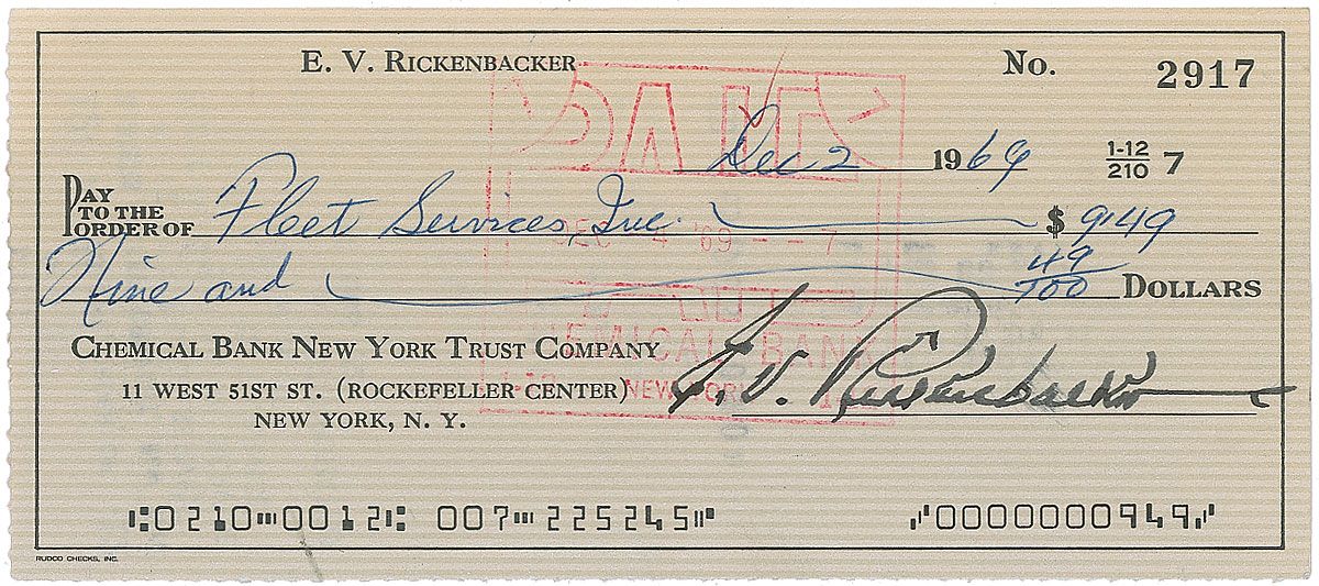 Personal check, 6.25 x 2.75, filled out in another hand and signed by Rickenbacker, “E. V. Rickenbacker,” payable to Fleet Services Inc. for $9.49, December 2, 1969. In fine condition, with a slight brush to end of signature, and a light bank stamp to front, slightly over the beginning of bold signature.