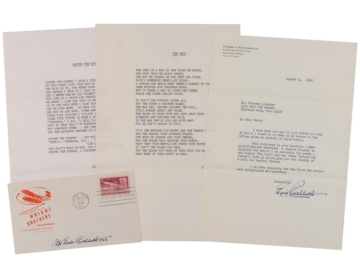 TLS, one page, 7.25 x 10.25, personal letterhead, August 3, 1966. Letter answering an unusual question from an admirer. In part: “With reference to your question—what qualifications determine a sincere friend; to simplify the matter I am enclosing two poems—one titled ‘The Test’ and the other ‘Around the Corner,’ both of which give you the meaning of a real and lasting friend. I am also enclosing the two First Day covers duly autographed as requested.” In fine condition. Accompanied by the original mailing envelope, the two poems mentioned in the letter, and one FDC, with a cachet honoring the Wright Brothers, signed in ink by Rickenbacker.