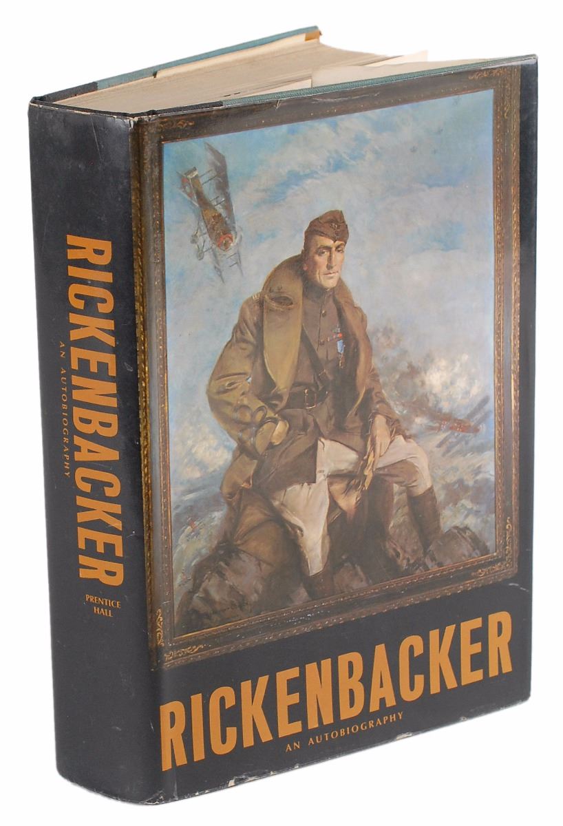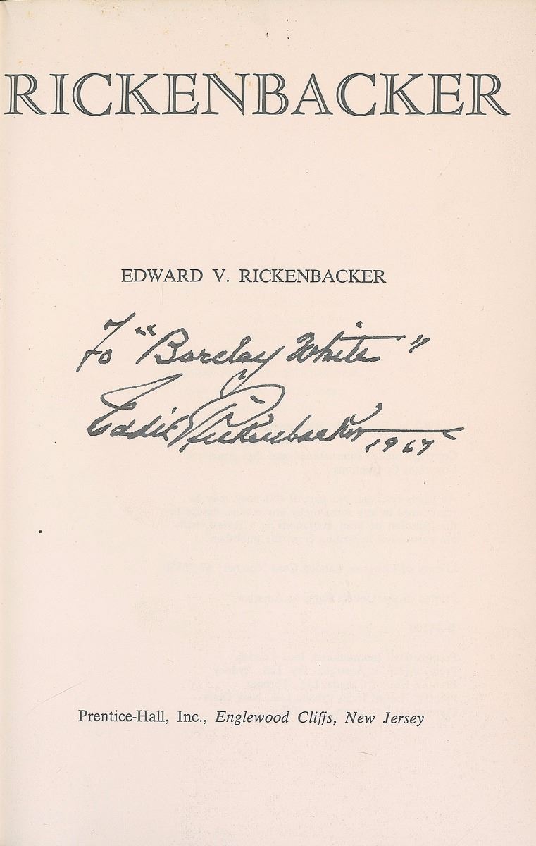 Signed book: Rickenbacker: An Autobiography. Eastern Air Lines Employees Special First Edition. New Jersey: Prentice-Hall, Inc., 1967. Hardcover with dust jacket, 6.25 x 9.25, 458 pages. Signed and inscribed on the title page in fountain pen, “To ‘Barclay White,’ Eddie Rickenbacker, 1967.” Trivial foxing to pastedown, end pages, signed page, and textblock edges, and light wear and small tears to dust jacket, otherwise fine condition.