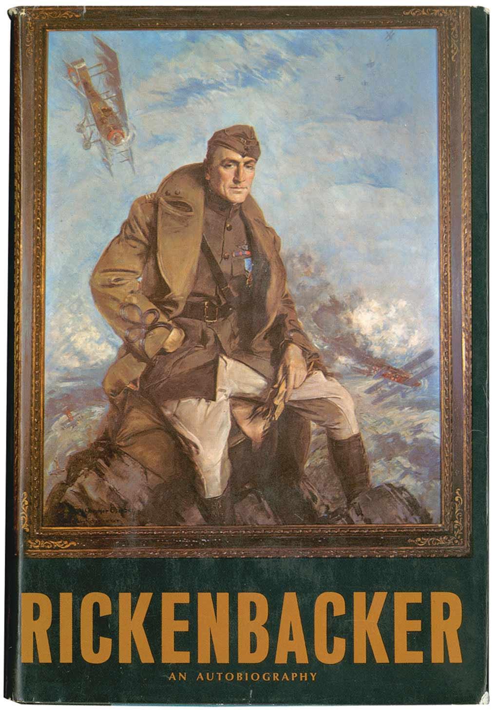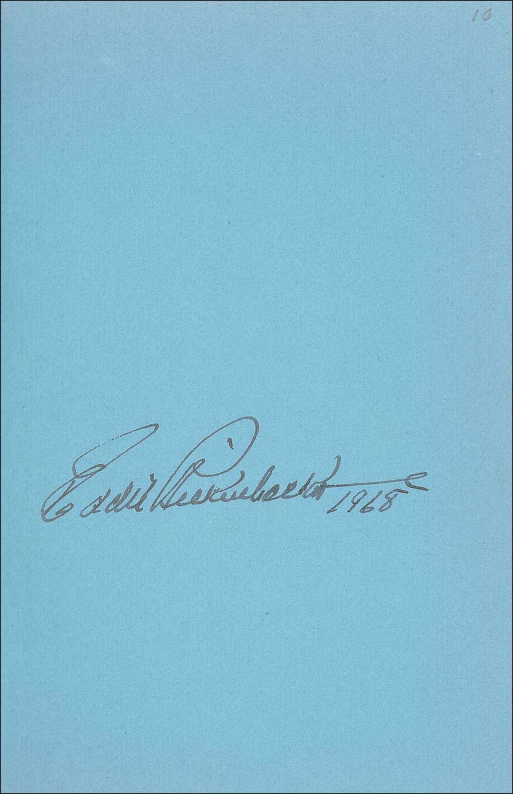 America’s top World War I ace (1890–1973), with twenty-six victories. Signed book: Rickenbacker. Later printing. New Jersey: Prentice-Hall, 1967. Hardcover with dustjacket, 6.25 x 9.25, 458 pages. Signed in black ink on the first free end page, “Eddie Rickenbacker 1968.” In fine condition, with a bit of light soiling to cover, price label to inside of dustjacket, and some scattered wear and tear to dustjacket.