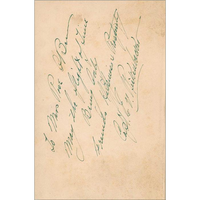 Signed book: Fighting the Flying Circus. First edition, first printing. NY: Frederick A. Stokes Company, 1919. Hardcover, 5 x 7.5, 371 pages. Signed and inscribed on the reverse of the half-title page, “To Mrs. Rose O’Brien, May the flight of Time bring only Friends, happiness, and Prosperity, Capt. E. V. Rickenbacker.” Foxing and toning to signed page, a few partially detached opening pages, partially detached and loose front hinge, spine a bit weak, and clipped front and back dustjacket covers affixed to covers, otherwise very good condition. RRAuction COA.