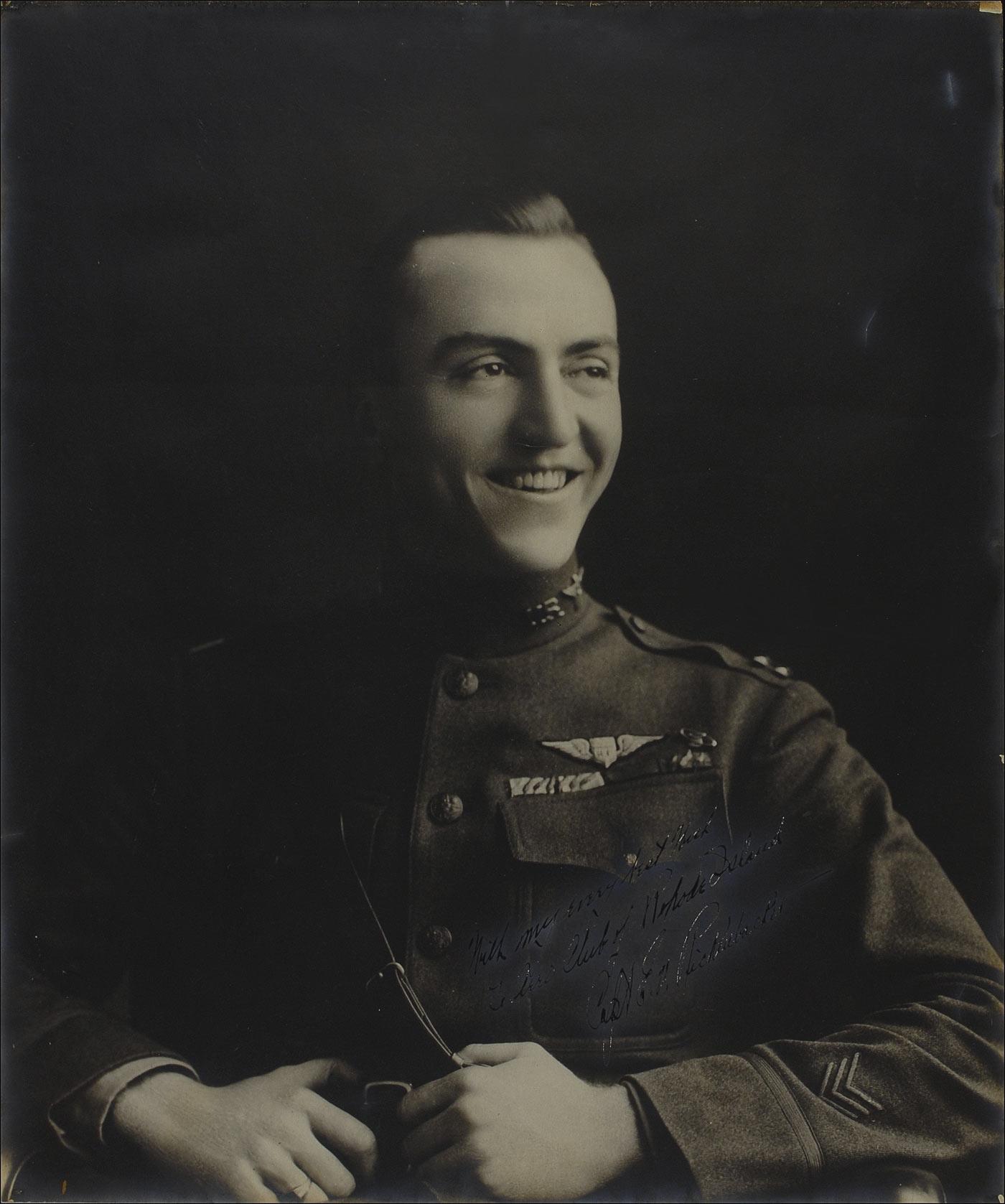 Huge vintage matte-finish 19.75 x 24 head-and-shoulders World War I-era photo of a young and proud Rickenbacker in his military dress uniform, signed and inscribed in fountain pen “With my every best wish to Aero Club of Rhode Island, Capt. E. H. Rickenbacker.” Rickenbacker served in the U .S. Army air corps from 1917 to 1919; during that time he was credited with 26 air victories, for which he was awarded the Congressional Medal of Honor. In very good condition, with silvering to signature and inscription, as well as some light silvering to background and edges from previous framing, a horizontal bend through facial area, some scattered ink loss to signature and inscription, slightly affecting legibility, and a thin strip of adhesive remnant along top edge. The most remarkable Rickenbacker signed photo you will likely encounter. Pre-certified PSA/DNA and RRAuction COA.