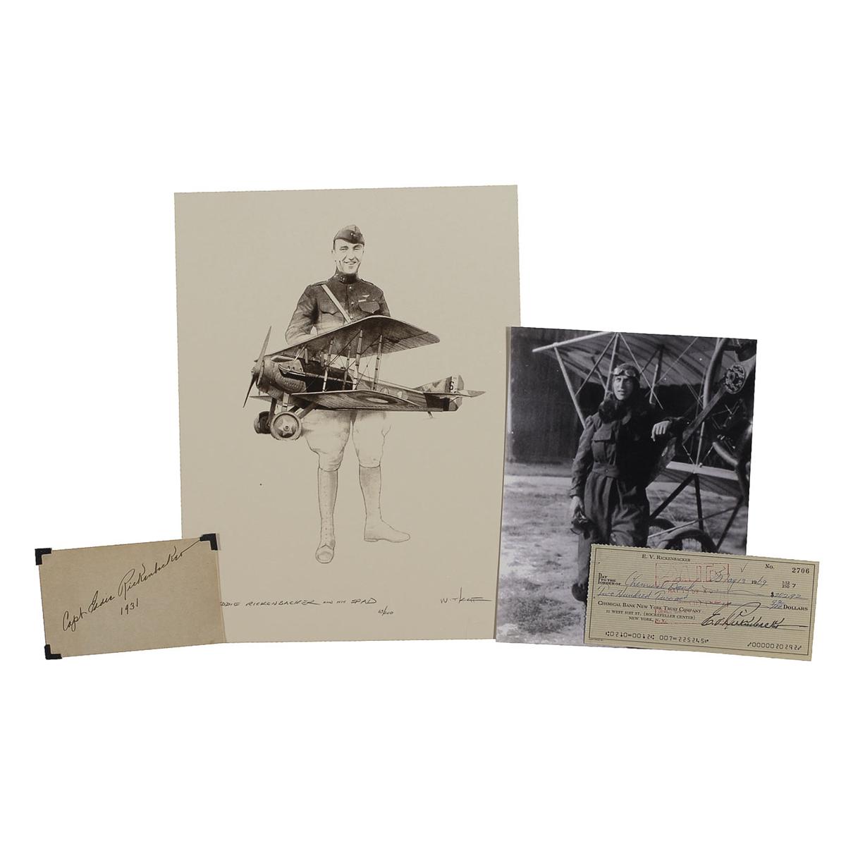 Two items: vintage fountain pen signature, “Capt. Eddie Rickenbacker 1931,” on an off-white 5 x 3 card; a personal check from 1969, filled out in another hand and signed “E. V. Rickenbacker.” Cancellation stamp over beginning portion of check signature and three corner mounting remnants and uniform mild toning to signature, otherwise fine condition. Accompanied by an unsigned glossy photo and a 9.5 x 12.5 limited edition print of Rickenbacker, signed by the artist.
