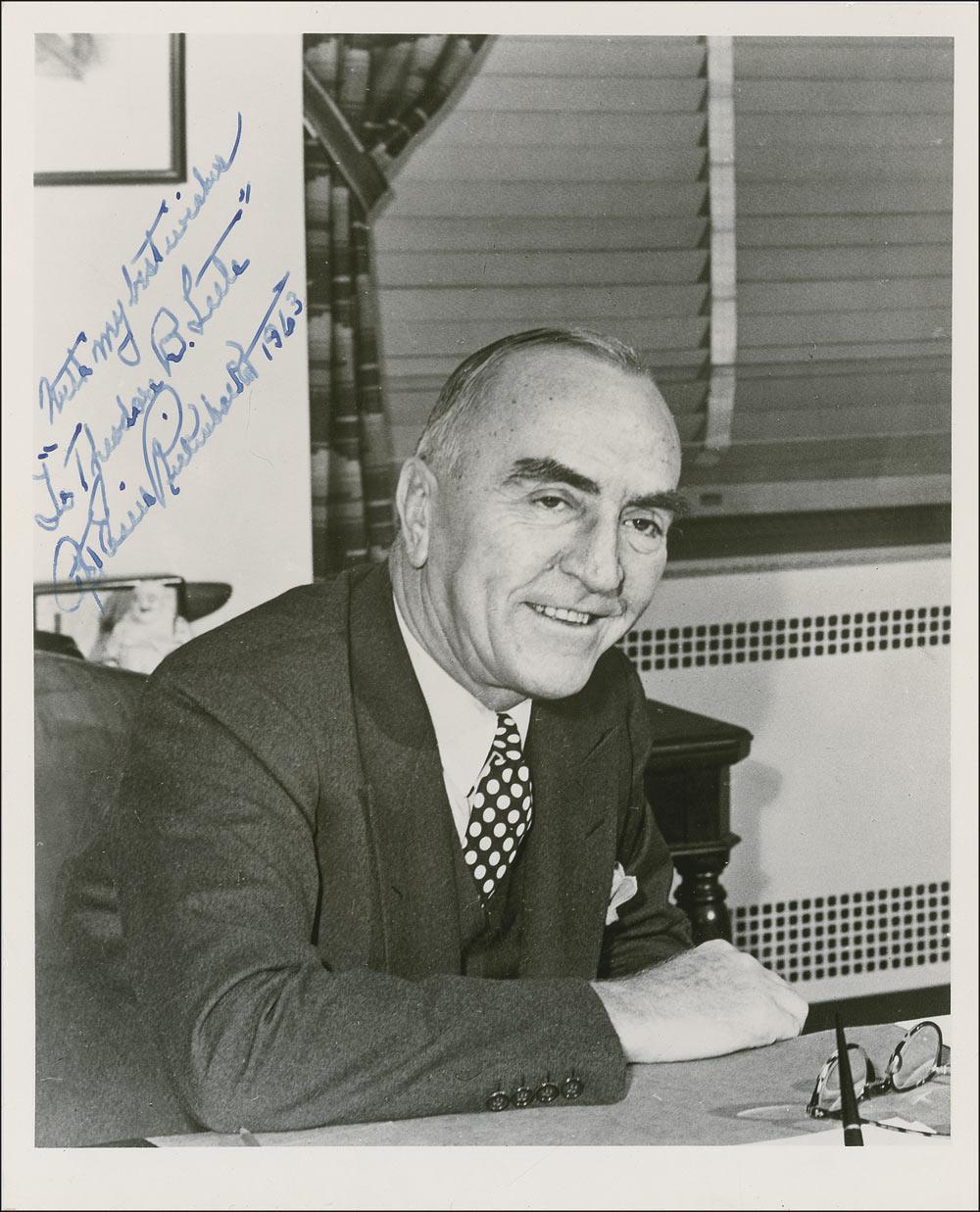 Glossy 8 x 10 photo of Rickenbacker seated at his desk, signed and inscribed in fountain pen “With my best wishes to ‘Theodore B. Leete,’ Capt. Eddie Rickenbacker 1963.” In fine condition, with few scattered creases and scratches (two passing through the inscription).
