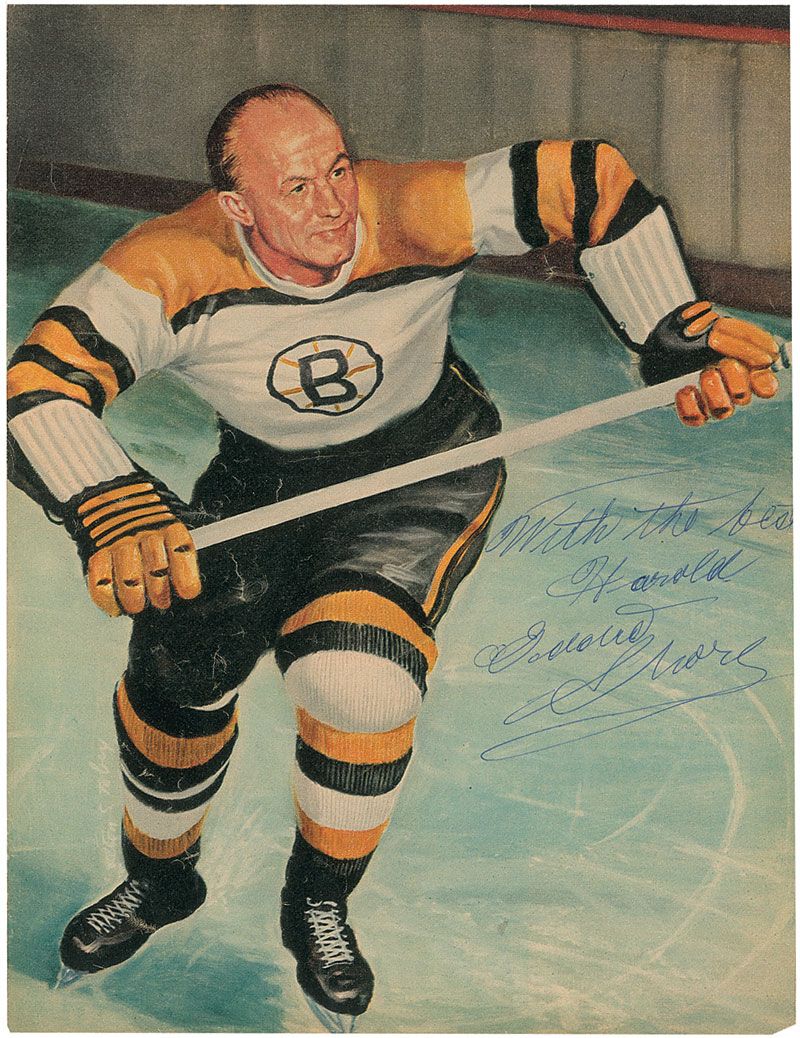 Hockey Hall of Famer (1902–1985) who was the only NHL defenseman to win the Hart Trophy as MVP four times. Color 8.25 x 10.75 magazine photo of an artist’s rendition of Shore on the ice for the Boston Bruins, signed and inscribed in blue ballpoint “With the best Harold, Eddie Shore.” In fine condition, with a few minor wrinkles and creases.