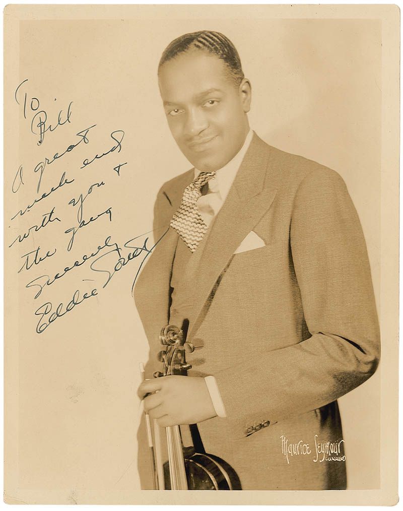 Jazz violinist (1904–1962) known for playing in multiple jazz orchestras and big bands, and for recording with legends like Django Reinhardt and Stephane Grappelli. Vintage glossy 8 x 10 publicity photo by Maurice Seymour, signed and inscribed in fountain pen “To Bill, A great week with you & the gang, Sincerely, Eddie South.” Scattered surface creases and impressions, and a few areas of mild soiling, otherwise fine condition.