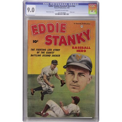 <B>Eddie Stanky #nn (Fawcett, 1951) CGC VF/NM 9.0 Off-white to white pages.</B></I> OK baseball fans, who played second base during Jackie Robinson's first appearance with the Brooklyn Dodgers in 1947? We'll give you a hint: this is the catalog description of a comic called <B>Eddie Stanky</B></I>! We had never seen this issue before, and since this copy's near the top of CGC's census, we expect crossover interest from sports collectors on this one. Overstreet 2006 VF/NM 9.0 value = $317; NM- 9.2 value = $420. CGC census 11/06: 2 in 9.0, 1 higher.<BR><BR><b>Shipping:</b> Slabbed Comic (<a target="_blank" href="http://www.heritageauctions.com/common/shipping.php">view shipping information</a>)