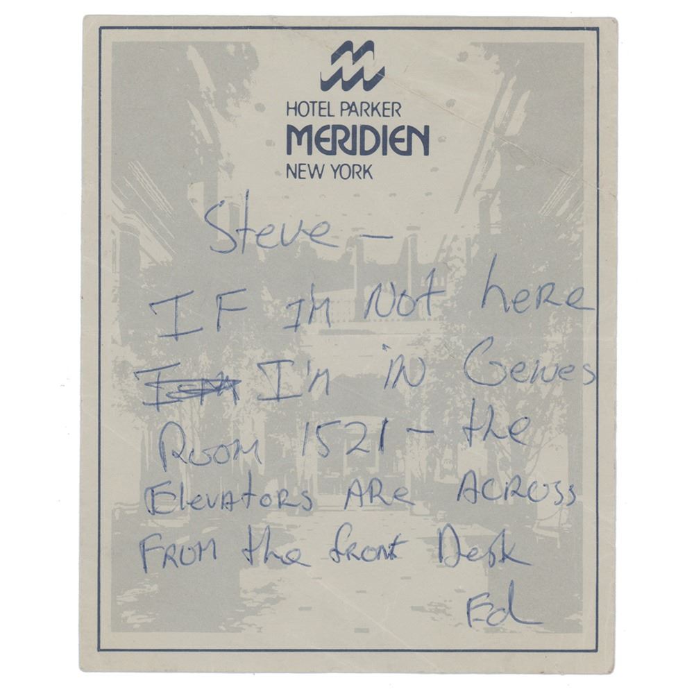 Sought-after Van Halen guitar pick used on stage by Eddie Van Halen during the band‰Ûªs 1982 Diver Down Tour. The bronze tortoise shell pick bears the golden Van Halen name and logo to the front with a blank reverse. Included with the pick is an ALS signed ‰ÛÏEd,‰Û one page, 4.25 x 5.25, Hotel Parker, Meridien, New York stationery, no date (circa 1980s), addressed to Van Halen‰Ûªs publicist Steve Mandel, in full: ‰ÛÏIf I‰Ûªm not here I‰Ûªm in Gene‰Ûªs room 1521‰ÛÓthe elevators are across from the front desk.‰Û In overall fine condition, with some folds and creases to letter. Accompanied by a full letter of authenticity from REAL, as well certificates of authenticity signed by Mandel, who affirms that the pick and letter derive from his personal collection.