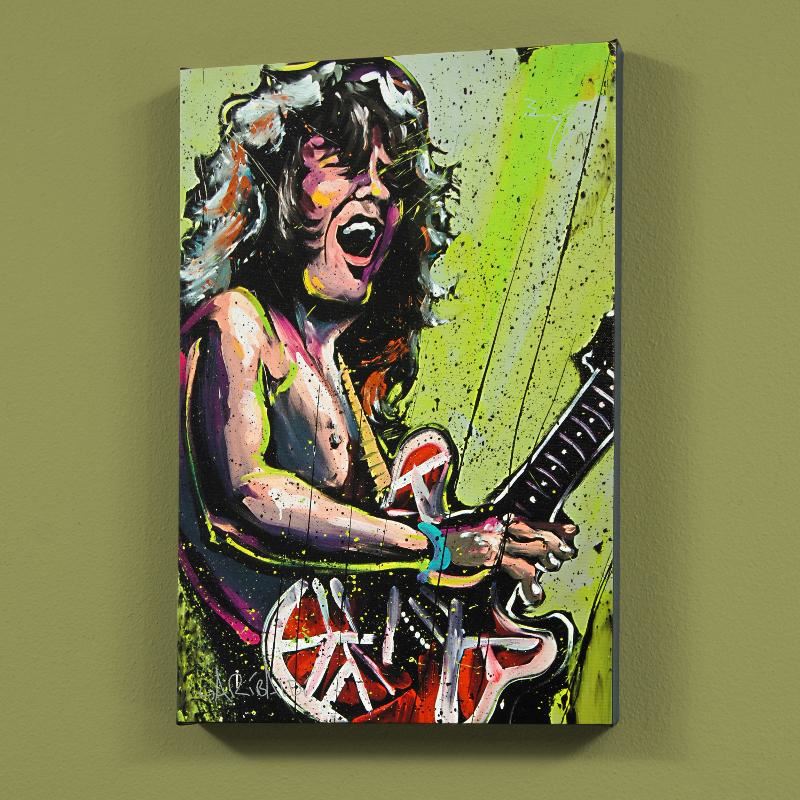 Combining his passions for music and art, David Garibaldi creates stunning visual poetry. "Eddie Van Halen (Eddie)" is a limited edition giclee on stretched canvas, numbered and bearing the artist's authorized signature. This piece comes gallery wrapped. Includes Certificate of Authenticity! Measures approx. 18" x 24" (image).