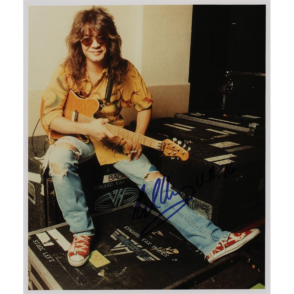 Color glossy 8 x 10 photo of Eddie Van Halen sitting on his road gear, signed in blue felt tip. In very fine condition, with moderate signature contrast.